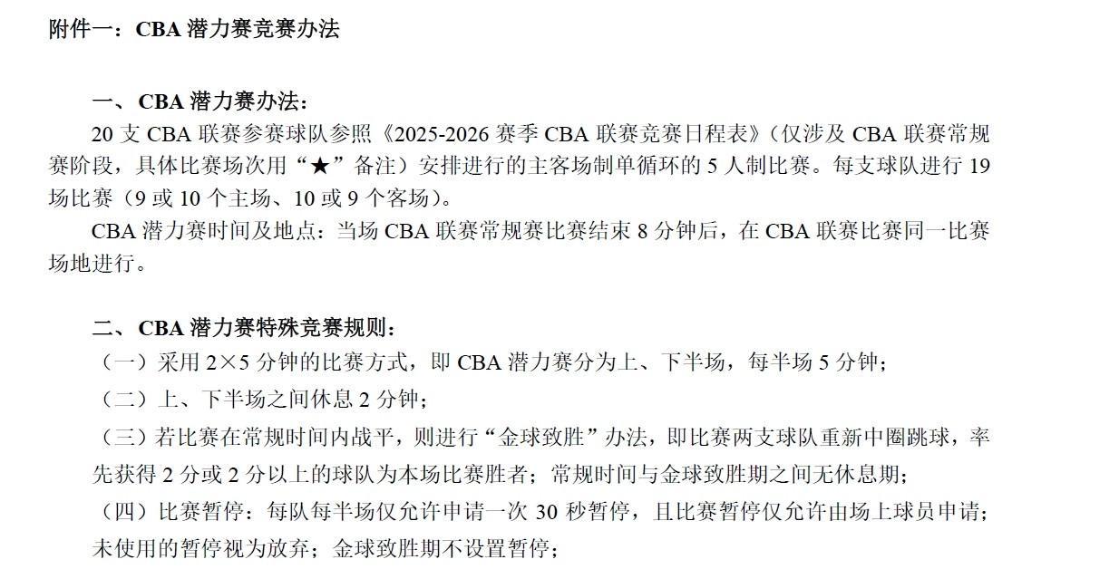 CBA潛力賽采用2×5分鐘的比賽方式,即CBA潛力賽分為上、下半場(chǎng),每半場(chǎng)5分鐘。若比賽在常規(guī)時(shí)間內(nèi)戰(zhàn)平,則進(jìn)行“金球致勝”辦法,即比賽兩支球隊(duì)重新中圈跳球,率先獲得2分或2分以上的球隊(duì)為本場(chǎng)比賽勝者;常規(guī)時(shí)間與金球致勝期之間無(wú)休息期。