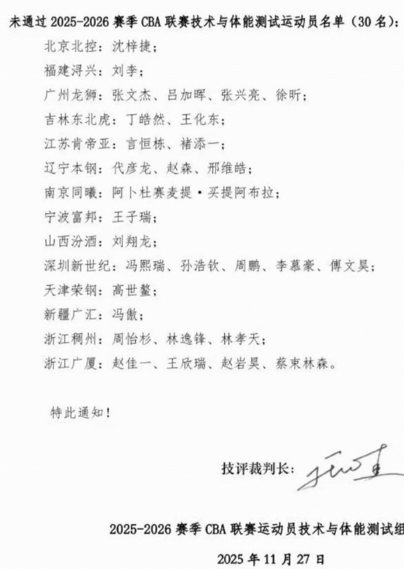 北京時間11月27日,CBA官方發(fā)布公告,本次CBA體測共有三十名運動員未通過,需要補測。