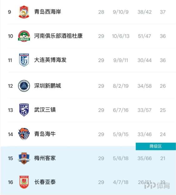 本輪過后,深圳新鵬城與武漢三鎮(zhèn)攜手上岸,確定保級;青島海牛全取三分后保級形勢大好;梅州客家收獲平局保留希望;長春亞泰則是屋漏偏逢連夜雨,不光經歷了一場慘敗,還在海牛取勝后確定降級,暫離中超賽場。