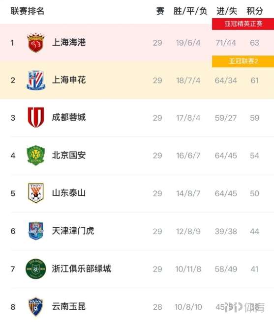 今晚,中超第29輪比賽已全部結束,本輪主場不敵河南的成都蓉城徹底掉隊,在僅剩一輪比賽的情況下,他們已落后榜首的上海海港4分,徹底無緣冠軍——仍有機會與申花爭奪亞冠二級聯(lián)賽名額;海港和申花則各取三分,將爭冠懸念保留到了最后一輪。手握相互戰(zhàn)績優(yōu)勢的海港將在最后一輪前往大連對陣英博,他們只需要一場平局就可成就中超三連冠偉業(yè);申花奪冠的條件則較為苛刻——他們首先需要客場戰(zhàn)勝津門虎,同時還要寄望于海港輸給英博。