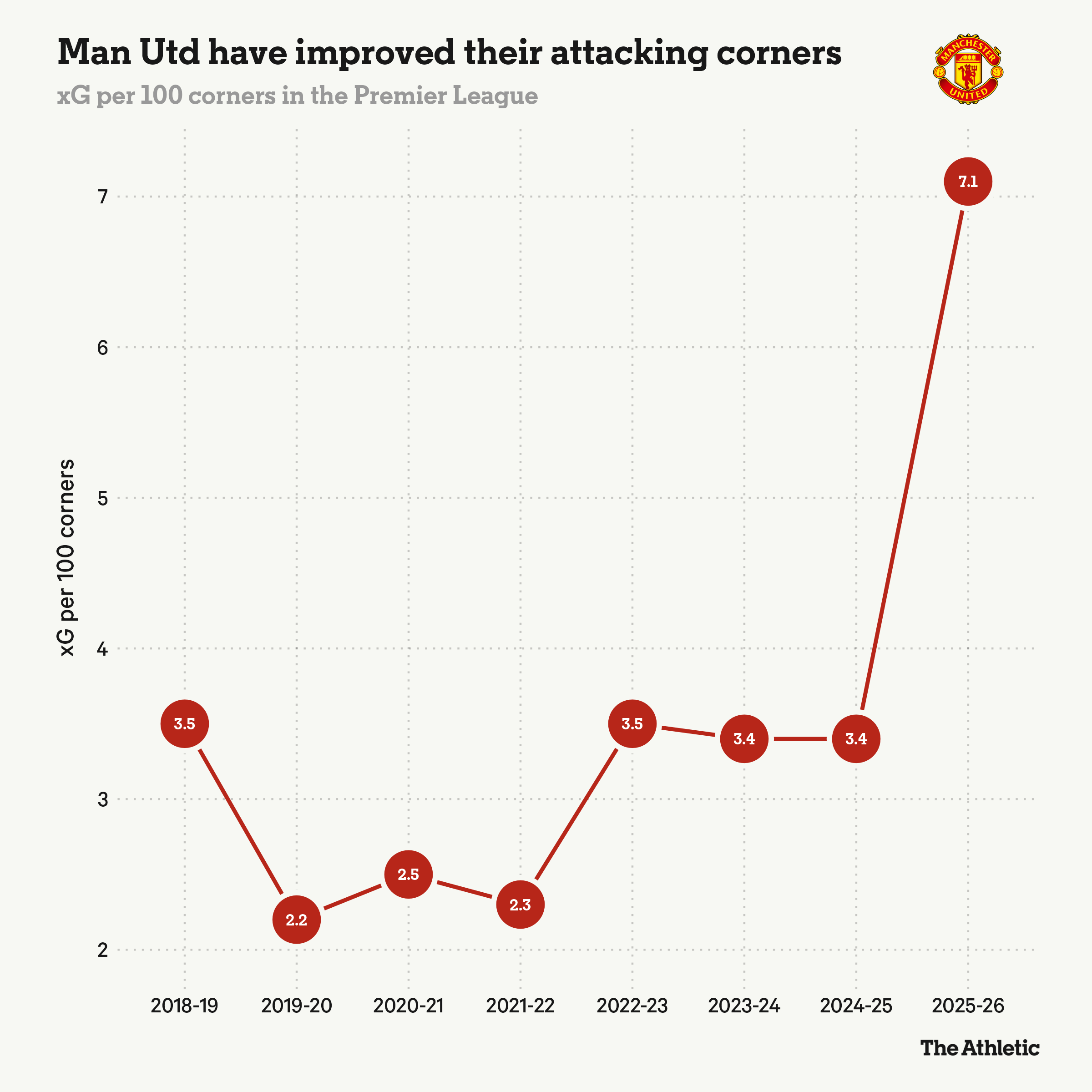 2025-26賽季曼聯(lián)進(jìn)攻角球的改進(jìn)得到了底層數(shù)據(jù)的支持。從球隊(duì)每100次角球的xG來看,他們目前7.1的數(shù)據(jù)是過去七個(gè)英超賽季中任意一個(gè)賽季的兩倍多。