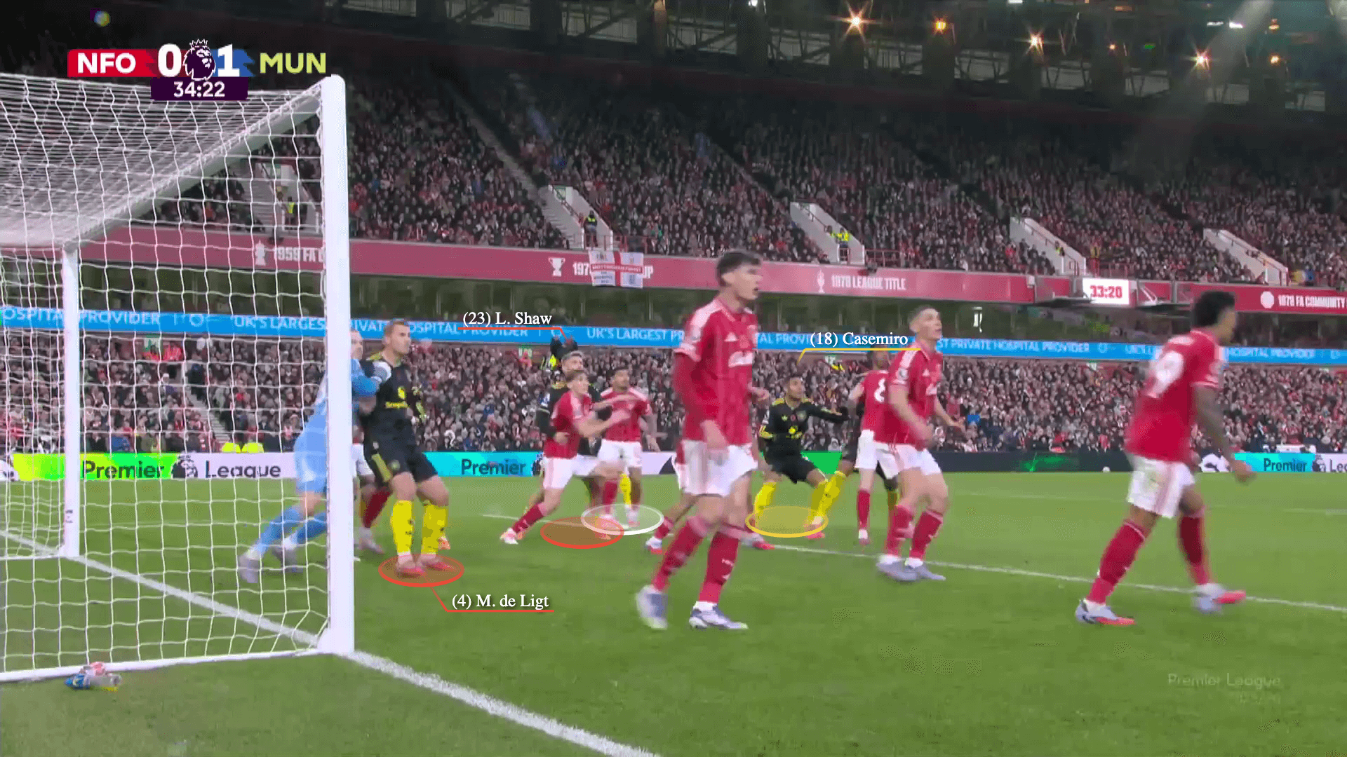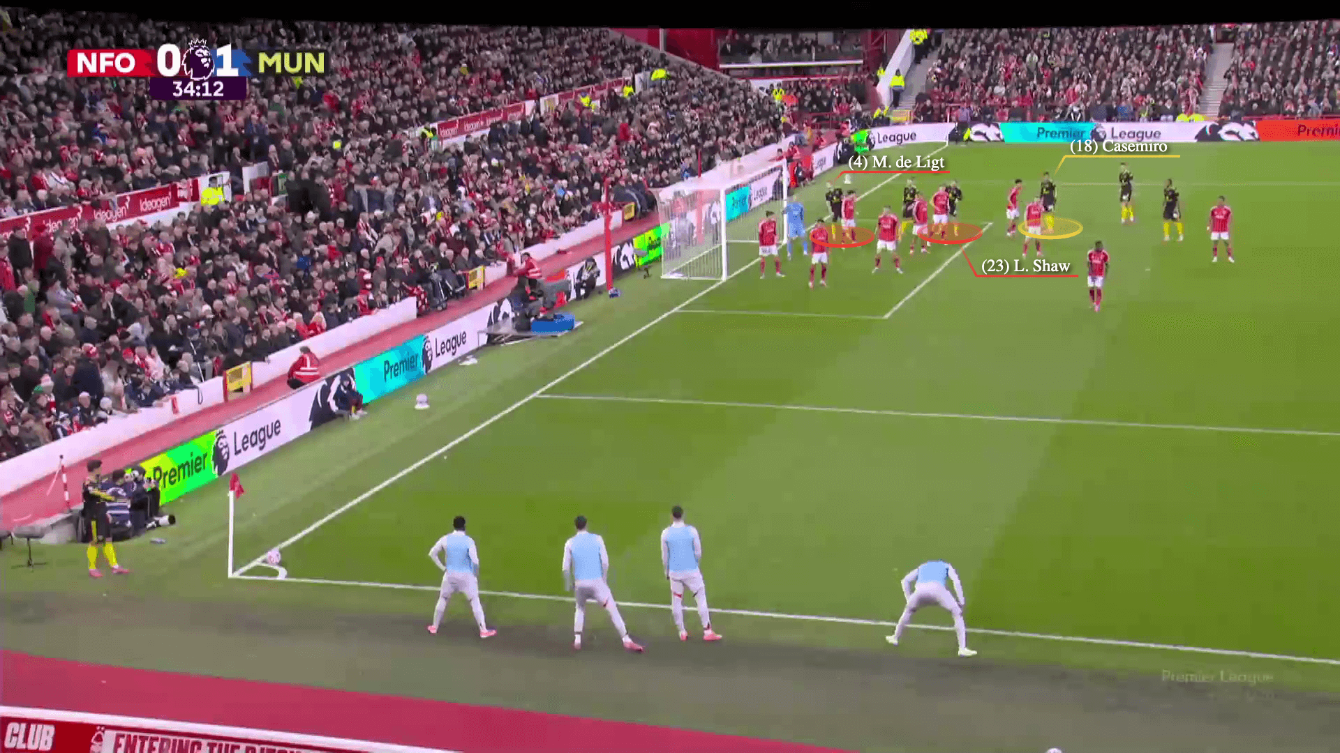 當(dāng)布魯諾-費(fèi)爾南德斯開始助跑時(shí),德利赫特(紅色)向?qū)Ψ介T將澤爾斯移動(dòng),而盧克-肖則靠近耶茨。謝什科(黑色)準(zhǔn)備攻擊后點(diǎn)。