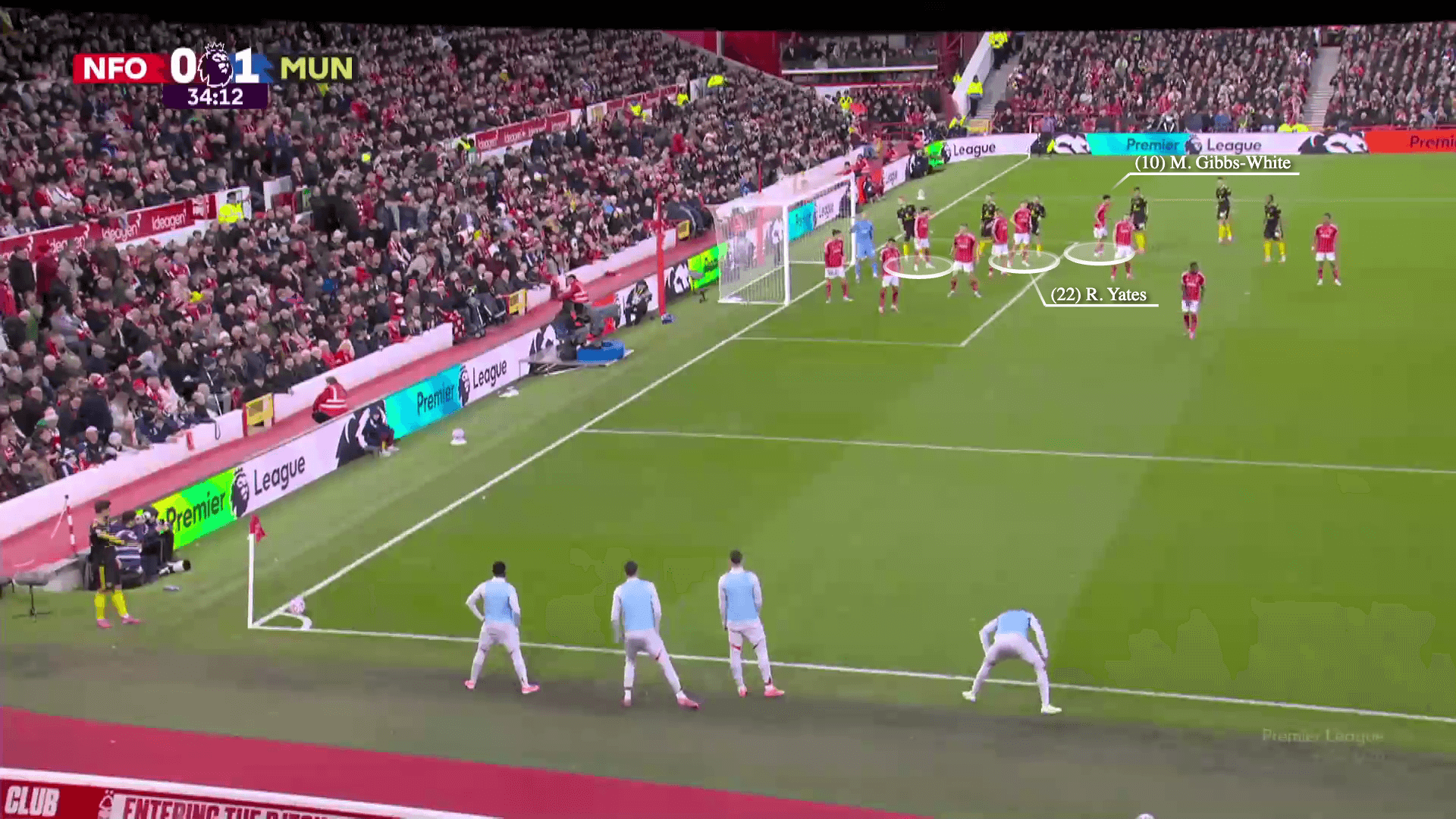 另一個(gè)例子來自本月2-2戰(zhàn)平諾丁漢森林的客場(chǎng)比賽。對(duì)手采用純粹的區(qū)域防守,內(nèi)科-威廉斯、耶茨和吉布斯-懷特負(fù)責(zé)防守后點(diǎn)區(qū)域。