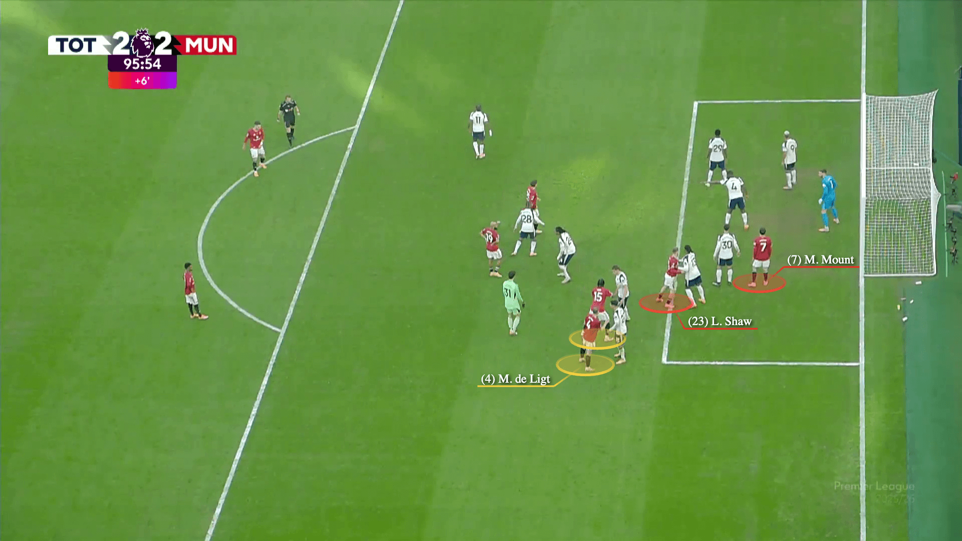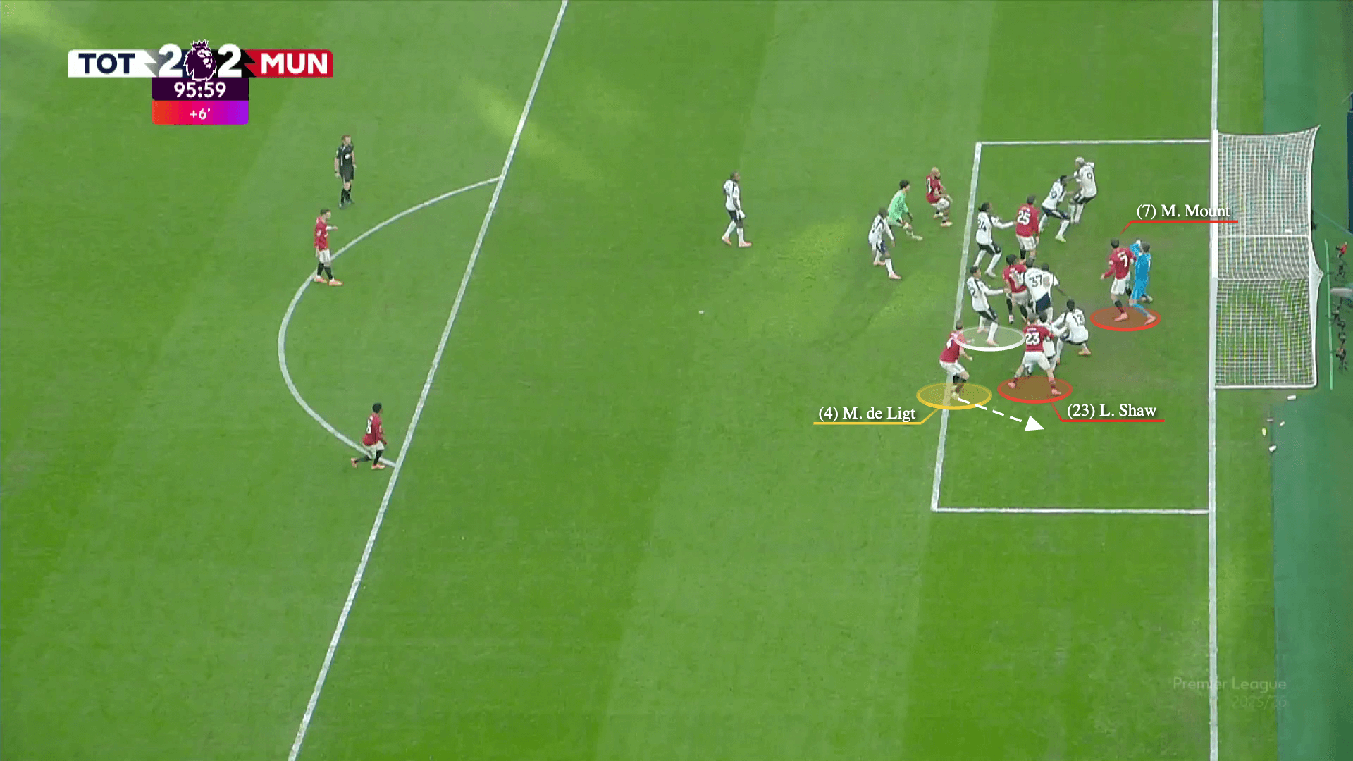 一旦曼聯(lián)隊(duì)長(zhǎng)開出角球,德利赫特改變方向沖向后點(diǎn),約羅移向中央?yún)^(qū)域,芒特則卡在了熱刺門將維卡里奧的身前。