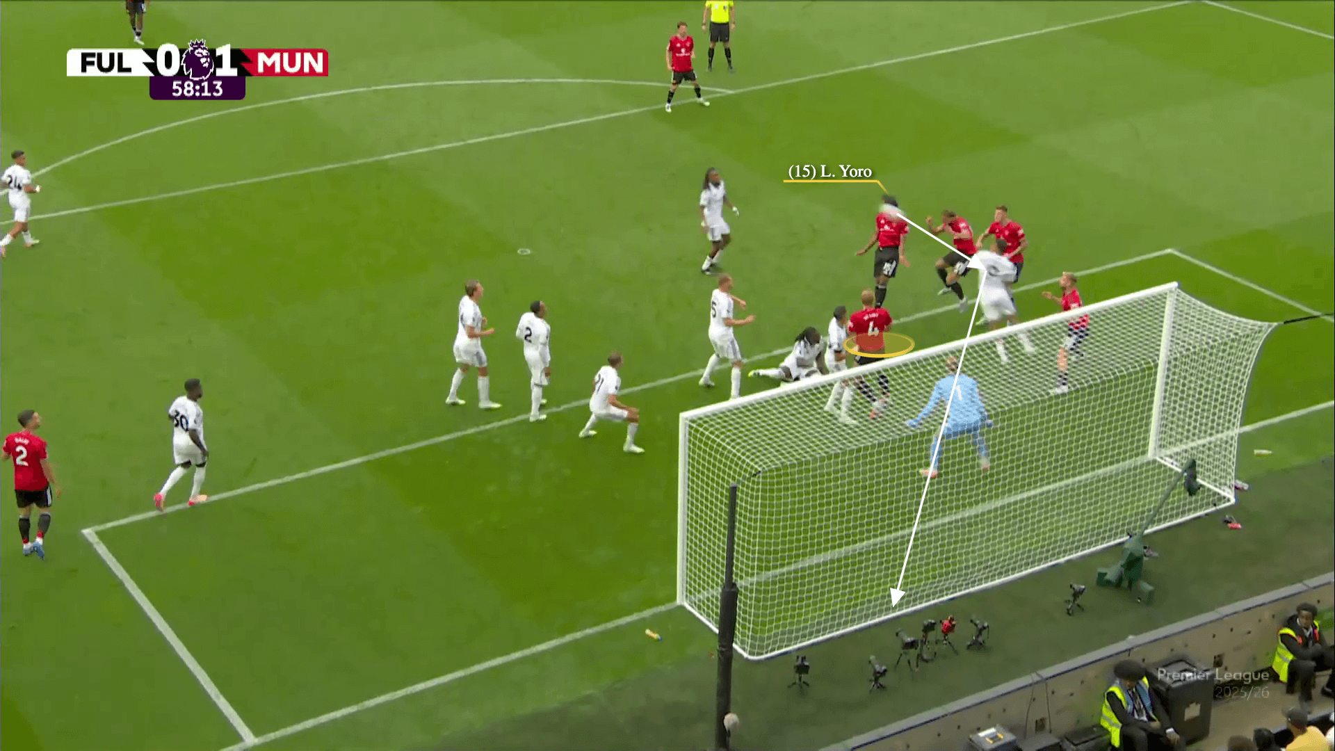 當(dāng)姆伯莫將內(nèi)旋角球開向后點(diǎn)時(shí),盧克-肖在那個(gè)區(qū)域牽制住了富勒姆的區(qū)域防守球員羅德里戈-穆里斯。相應(yīng)地,約羅在目標(biāo)區(qū)域內(nèi)與巴錫形成一對(duì)一。