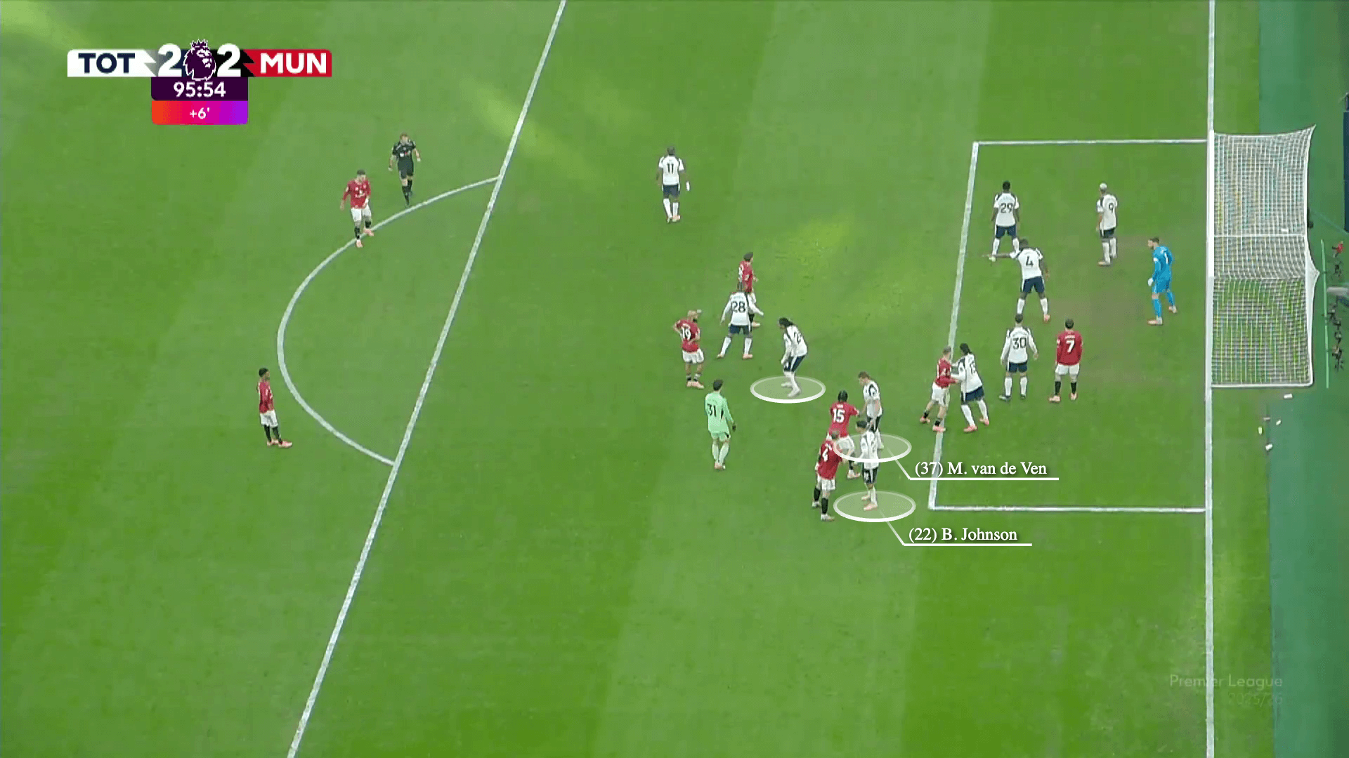 在導(dǎo)致曼聯(lián)最后時(shí)刻扳平比分的那個(gè)角球中,熱刺采用混合防守體系:馬蒂斯-特爾在點(diǎn)球點(diǎn)附近防守短角球選項(xiàng)或任何后插上的球員,奧多貝爾保護(hù)小禁區(qū)外圍空間,小禁區(qū)內(nèi)有五名區(qū)域防守球員,三名人盯人防守球員(白色標(biāo)記)盯防后點(diǎn)。