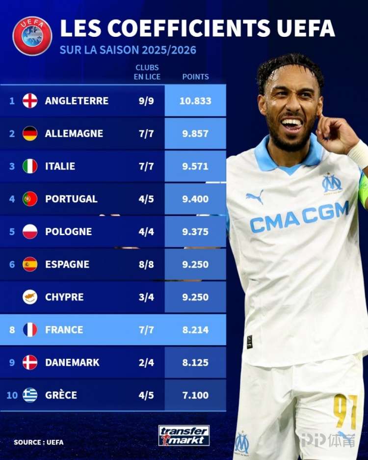 德國轉(zhuǎn)會市場列出了本賽季歐戰(zhàn)積分排名,英超、德甲前兩位,意甲升至第三位。