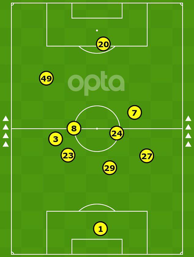 加納喬被換上場是為了在左路拉開寬度,他盡量保持高位和邊路站位,除非需要幫助庫庫雷利亞防守,加納喬還被告知要留在高位,等待里斯-詹姆斯送出精準(zhǔn)的斜長傳。