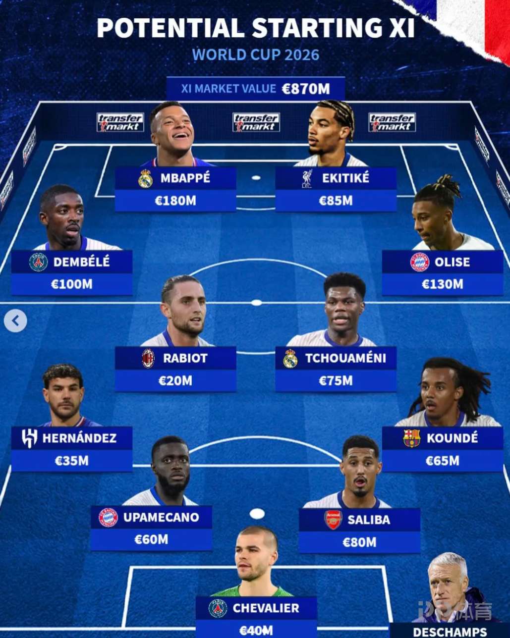 德轉(zhuǎn)公布了法國在2026年世界杯的預計首發(fā)十一人。陣容總身價為8.7億歐,其中前鋒姆巴佩以1.8億歐的身價為全隊最高。