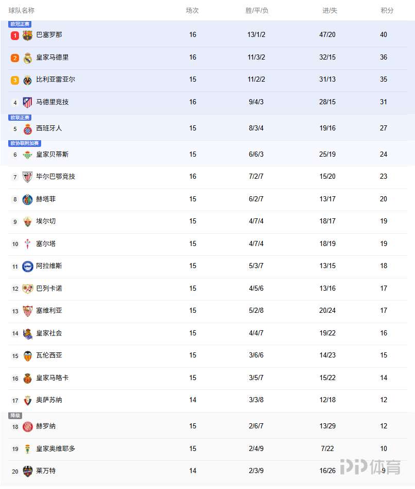 西甲第15輪,皇家馬德里主場爆冷不敵塞爾塔,5輪1勝3平1負。最新西甲積分榜形勢: