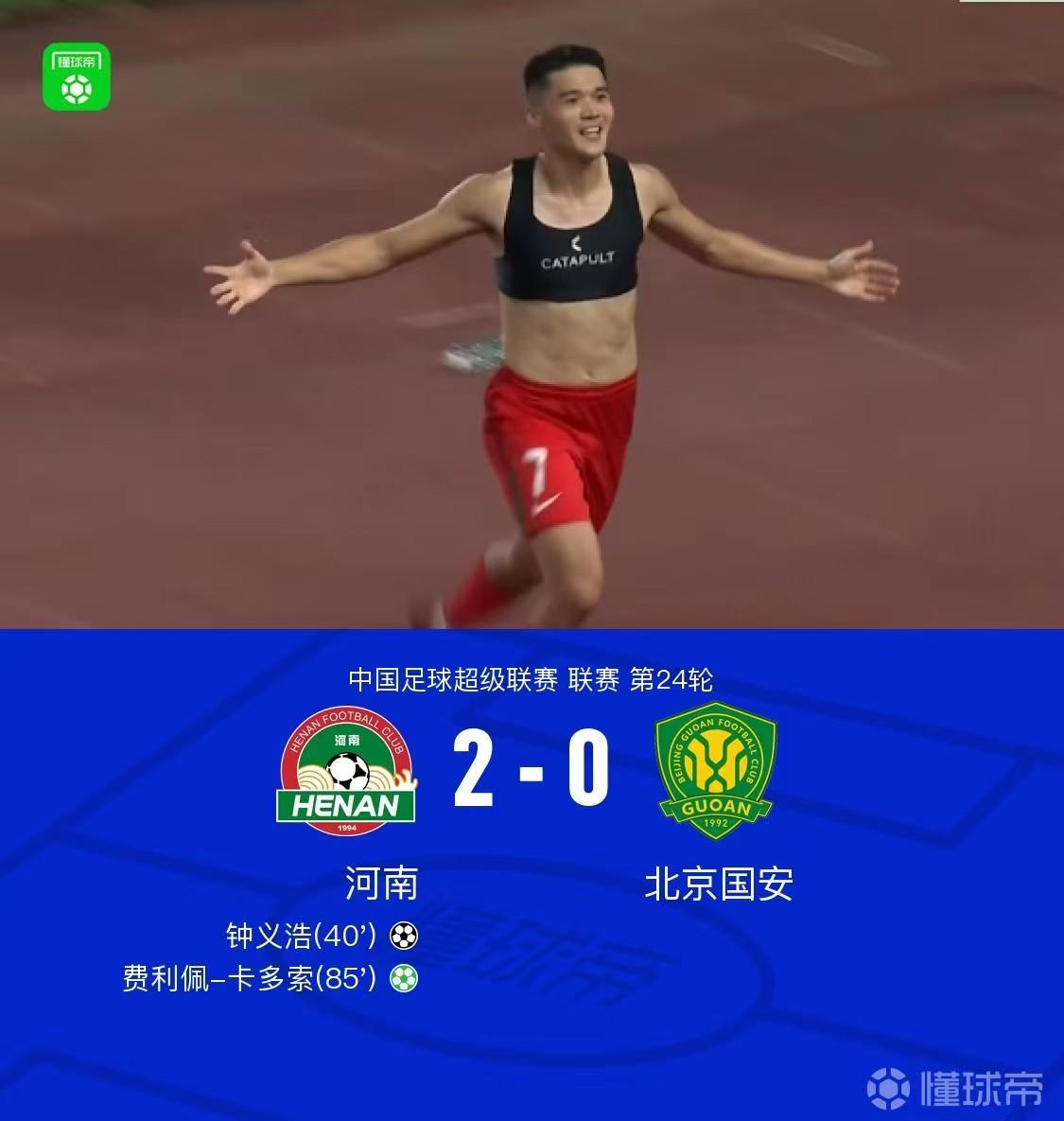 聯(lián)賽第24輪,河南隊(duì)移師航海2-0力克國(guó)安,鐘義浩在自己的百場(chǎng)里程碑完成破門(mén),下半場(chǎng)國(guó)安后衛(wèi)柏楊送點(diǎn),卡多索點(diǎn)射鎖定勝局。北京國(guó)安在0-6慘敗山東泰山后不敵河南遭遇兩連敗。