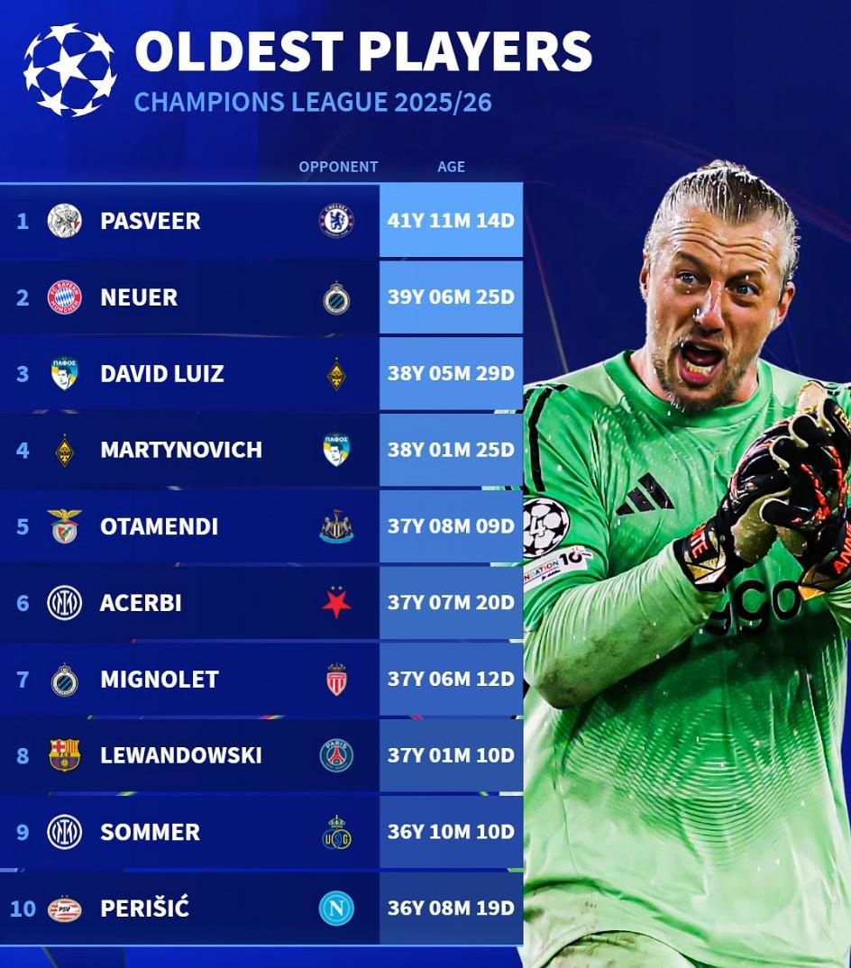 北京時間10月25日,德轉(zhuǎn)統(tǒng)計出了本賽季至今歐冠出場最年長的10名球員,阿賈克斯的門將帕斯維爾第一,諾伊爾第二,目前效力于塞浦路斯球隊帕福斯的大衛(wèi)-路易斯第三。