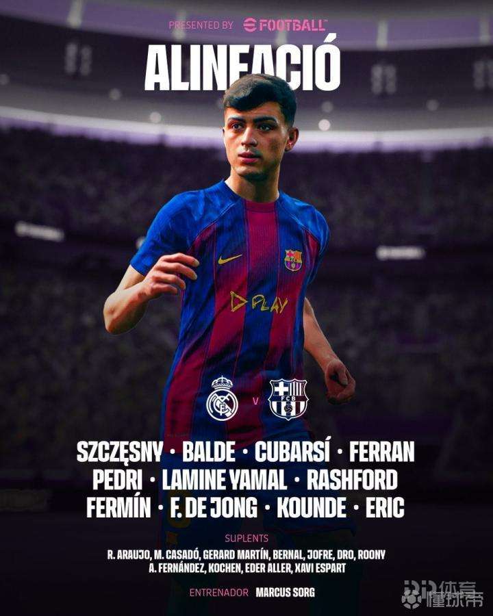 巴薩首發(fā):25-什琴斯尼、23-孔德、24-埃里克-加西亞、5-庫(kù)巴西、3-巴爾德、21-德容、8-佩德里、16-費(fèi)爾明、10-亞馬爾、14-拉什福德、7-費(fèi)蘭-托雷斯